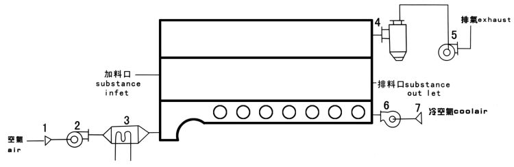 該干燥機(jī)采用液態(tài)化干燥原理。在氣體分布板上加入要干燥的顆粒物料,熱空氣由多孔板的底部送入。使其均勻地與物料接觸,當(dāng)物料達(dá)到流態(tài)化時,顆粒上、下翻動,彼此碰撞和混合。氣固間進(jìn)行傳熱和傳質(zhì),以達(dá)到干燥的目的。